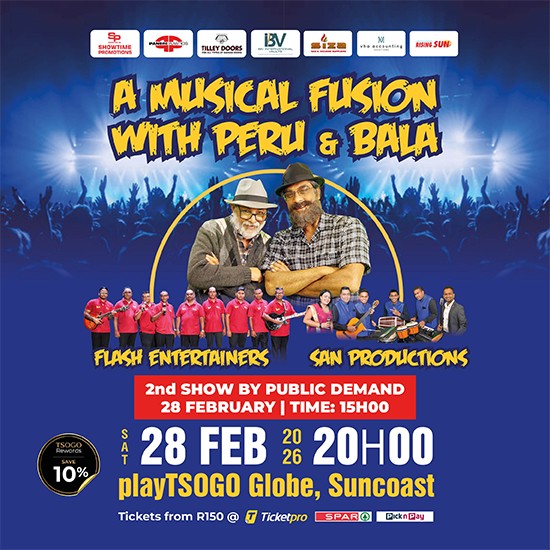 Showtime Promotions presents a musical blend of Chutney and Nagara with comedy by the popular uncles Peru & Bala featuring the local talents of Flash Entertainers and SAN Production’s for an evening filled with laughter, music and dance. We promise an evening filled with loads of chuckles and your favourite chutney music hits that will have you dancing along to, at A Musical Fusion with Peru & Bala on Saturday, 28th February 2026 at the playTSOGO Globe, Suncoast at 20H00. Tickets from R150 available online at Ticketpro / SPAR Outlets / Pick ‘n Pay outlets.