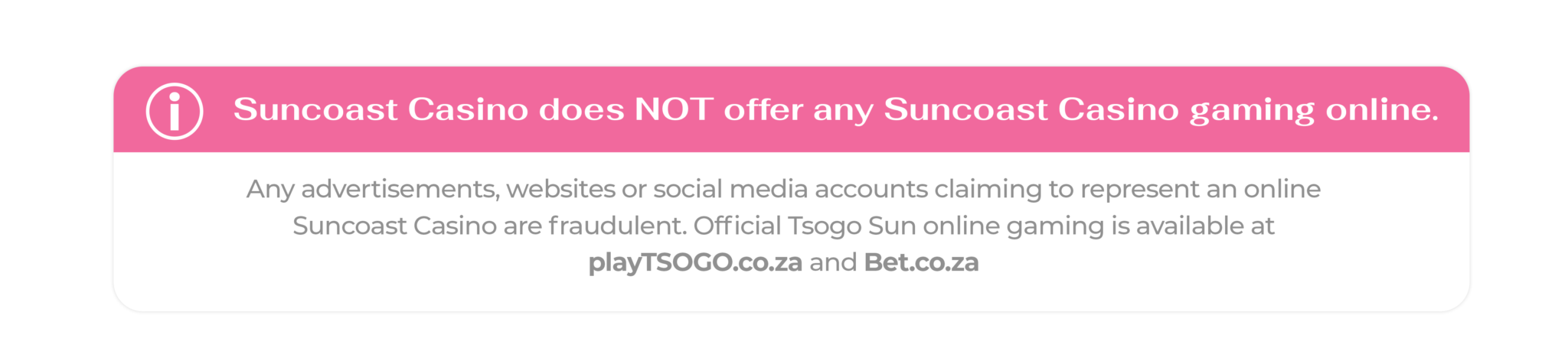 Play Slots or Tables and stand a chance to win your share of up to R175, 000 in cash and prizes this festive season. All Suncoast Tsogo Rewards Members earn 100 points weekly to be eligible for selection on activation days