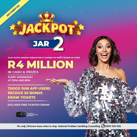 Jackpot Jar is overflowing with cash prizes of over R4 Million. Do not miss your chance to win every Wednesday at 12:00 and 20:00 from 4 February to 25 March 2026. Play, earn points, swipe your Tsogo Rewards Card, and let the jackpot excitement begin.