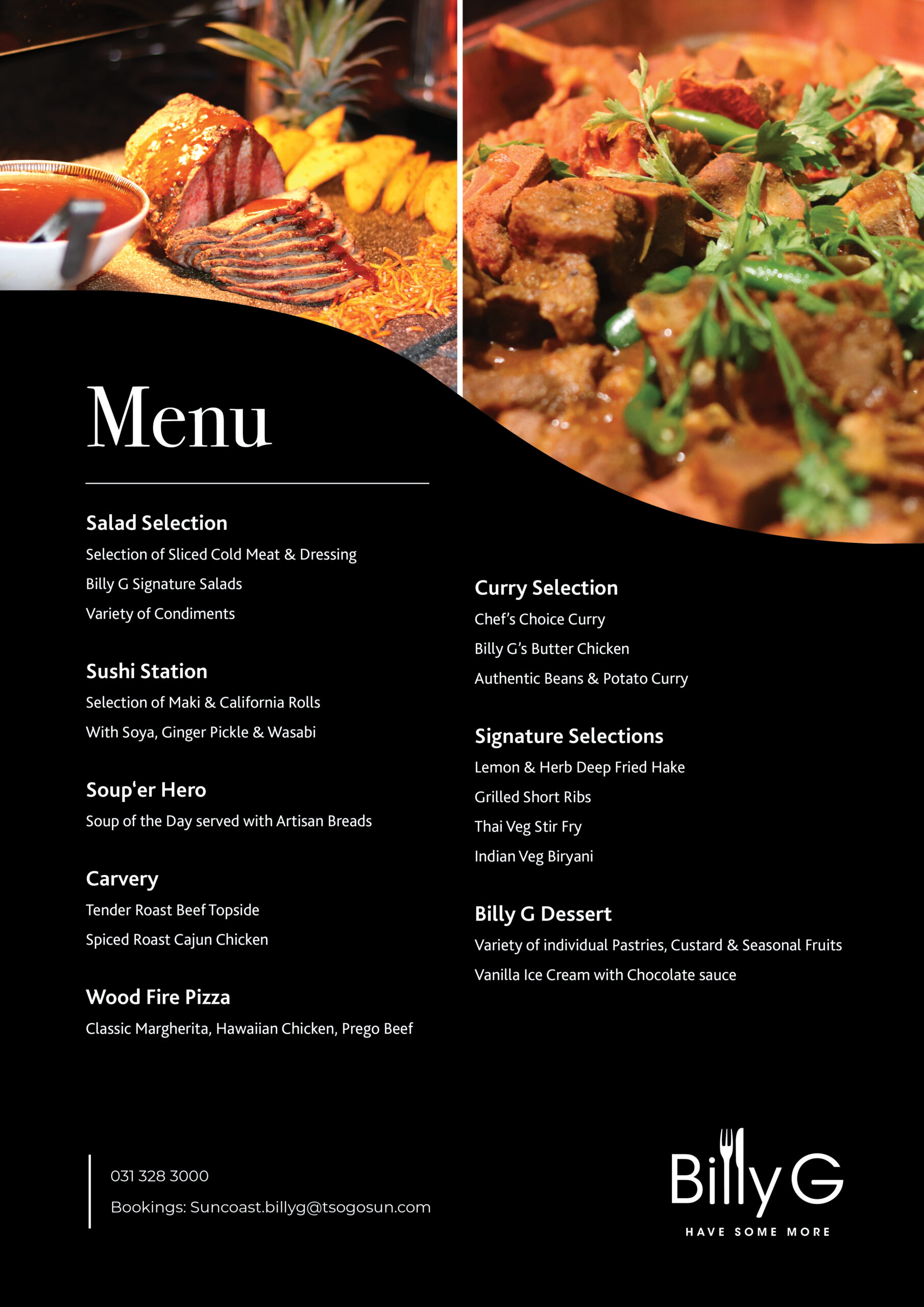 This family buffet restaurant located in Durban at Suncoast offers a variety of hot and cold starters, main courses and desserts. Enjoy everything from succulent cuts of meat at the carvery, to a variety of casseroles, curries and vegetarian offerings, seafood, pasta dishes, salads and desserts. Billy G is the best buffet restaurant for all your special occasions.