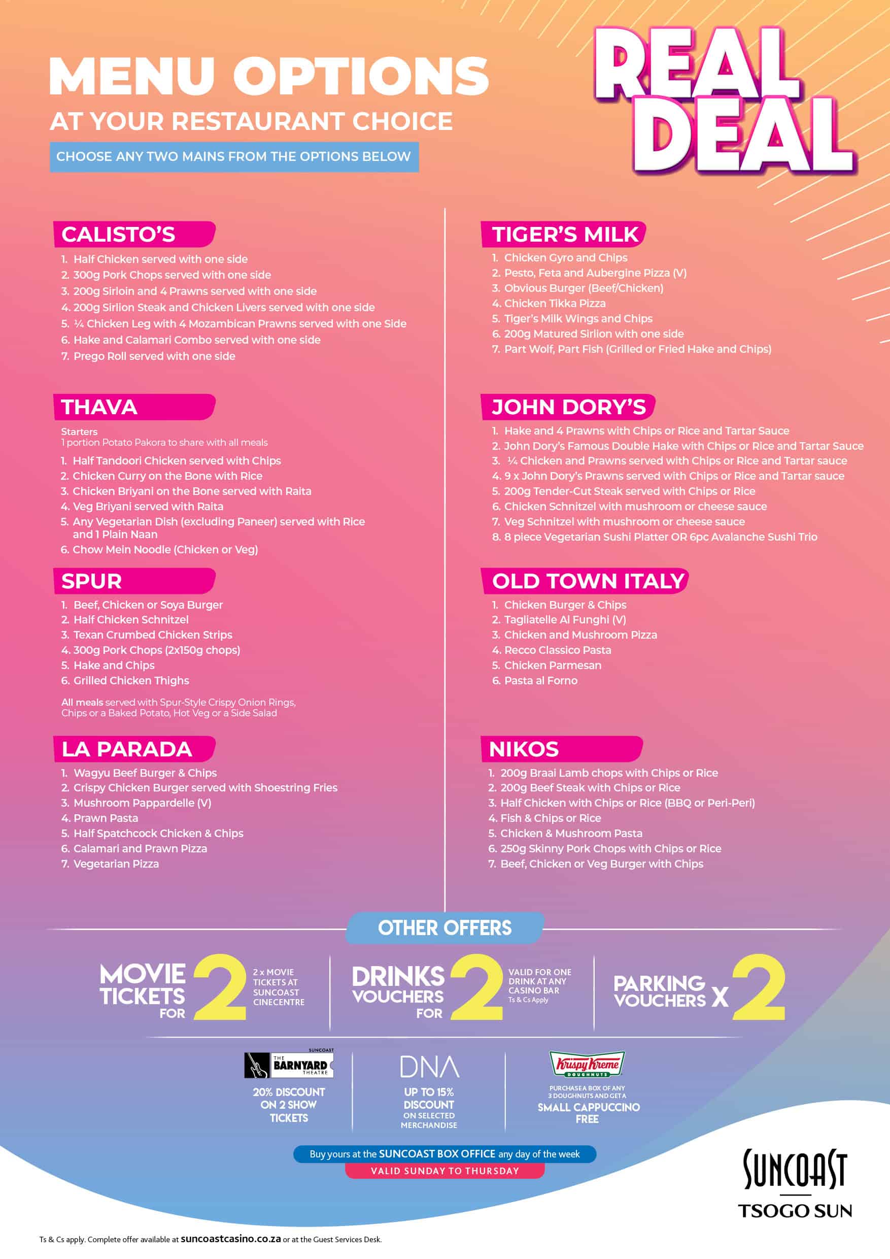 Buy your Real Deal booklet at the Suncoast Box Office open daily between 08h00 – 19h00 (Sunday – Thursday) and between 10h00 -17h00 on Friday and Saturday at the Guest Services Desk.