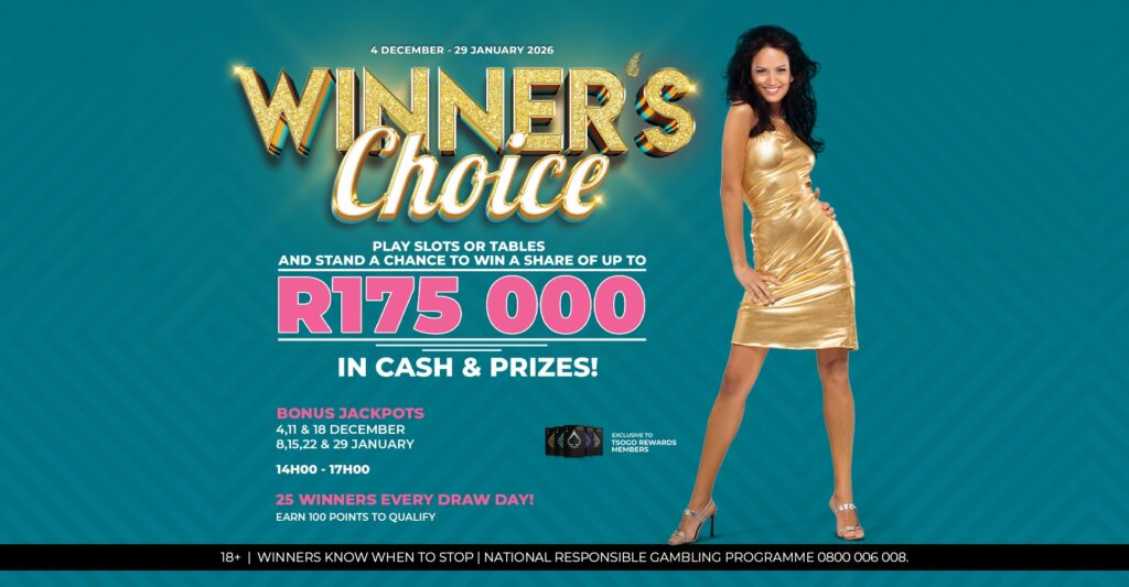 It’s Winner’s Choice at Durban’s Home of Entertainment! Play Slots or Tables and stand a chance to win your share of up to R175, 000 in cash and prizes. Earn 100 points (Thursday to Thursday) or on the day to qualify. No winning combinations required, just play your favourite Slots or Tables games and …